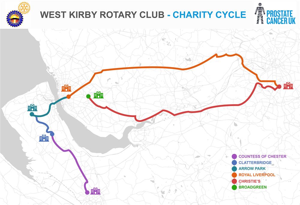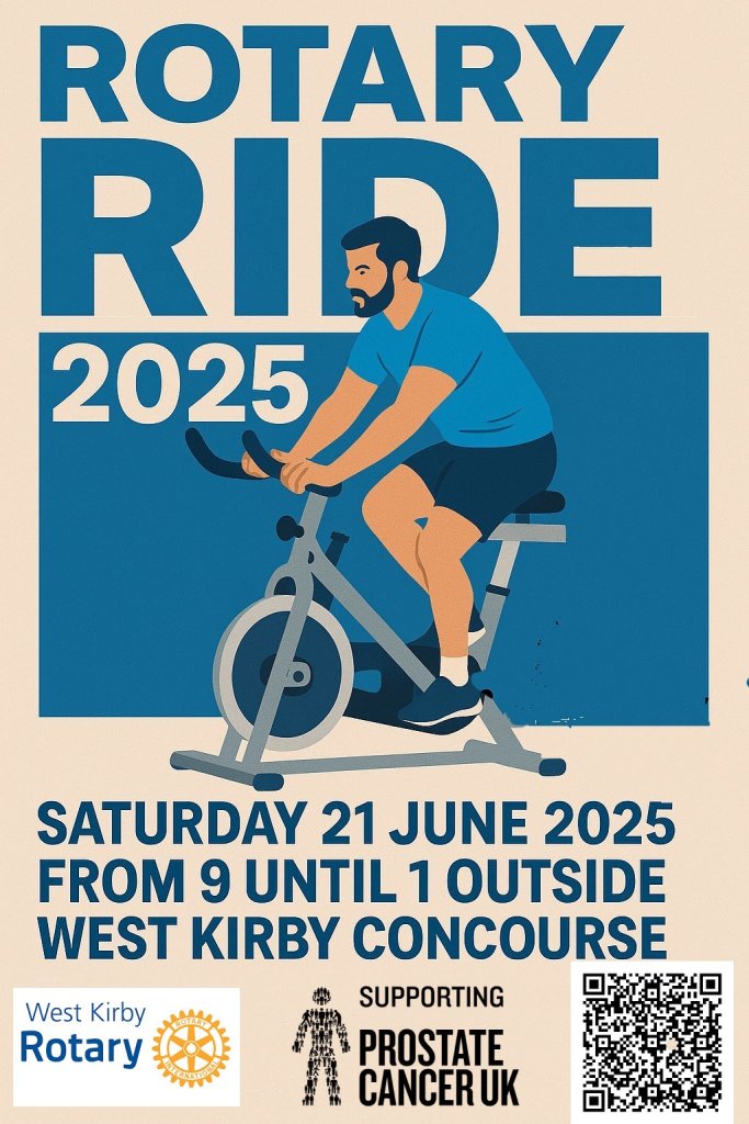 So, how’s your cycling? We need you and your bike (exercise or otherwise) as once again, West Kirby Rotary Club is fundraising for PROSTATE CANCER UK, and we would really appreciate your support. We are running a hybrid cycling event (and we’d love you to join in) using our road and exercise bikes to cycle ‘virtually’ between 7 key North West Cancer Centres on Saturday 21st June 2025. The route is – Countess of Chester, Clatterbridge, Arrowe Park, Royal Liverpool, Christies (Manchester) & back to Broadgreen. This will be a minimum of 170.6km between us, although with support of family, friends and fellow Rotarians we hope to clock up many more beating last year’s total of around 400Km. If you’re able to take part remotely on the day or in the week before or following, just record your mileage (or should that be kilometrage?), tag West Kirby Rotary on Facebook, Instagram or X with the distance travelled and we’ll add it all together for a final total. Photos are very welcome. Persuade your family and friends to join in too and donate or sponsor you.