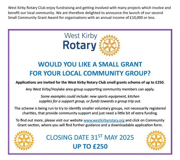 In the next couple of months we are planning litter picks around West Kirby, bag pack & collection at Morrisons, an Easter Egg collection again for a local Women and Children’s refuge – donations gratefully received – and a couple of other activities to be finalised alongside our regular events – see our Diary 2025 page.